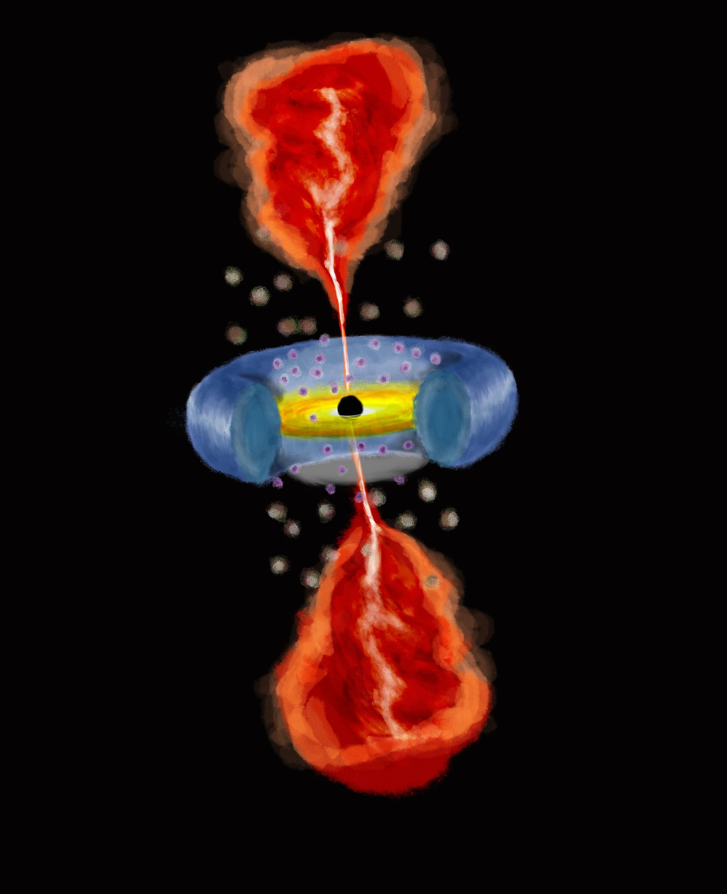 The basic structure of almost all AGN is rather similar and can be seen in the schematic picture (artwork by Lucia Zarantonello). The supermassive black hole, with a mass from one hundred thousand solar masses up to tens of billions of solar masses, resides in the centre. We of course cannot see the black hole, but if it is accreting matter, this matter is emitting light through different processes. In the optical band (light visible to us humans) and the ultraviolet, we see the accretion disk that is feeding the black hole. Also, broad emission lines from the broad-line region consisting of ionised gas orbiting the black hole are visible in this regime. Close to the accretion disk, there are hot electrons that give a kick to the accretion disk photons and produce X-rays. This component is known as the X-ray corona. The centre - black hole, accretion disk, broad-line region, and X-ray corona - is surrounded by a dusty structure that absorbs accretion disk emission and re-emits it in the infrared band. From certain orientations this structure obscures our view of the central engine; this is the basis for orientation-based unification models. The accretion disk emission also ionises the gas in the host galaxy of the active galactic nucleus, usually in a biconical shape due to the dusty component absorbing some of the emission. This gas produces very narrow forbidden lines.